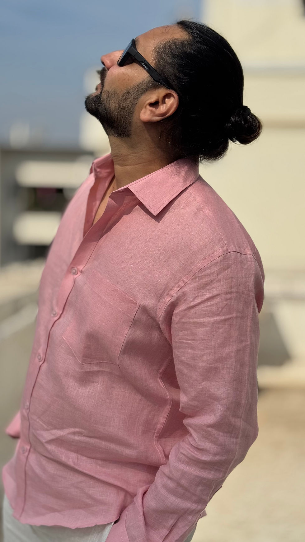 ![A smooth blend of subtle pink and earthy warm, this Smoked Onion Pink Pure Linen shirt brings effortless sophistication to your everyday wardrobe. Crafted from breathable, 60 lea pure European linen, this piece is a modern essential with quiet confidence and a timeless charm.